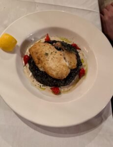 Served with squid ink risotto, piquillo peppers, coconut coulis, and basil oil—a beautifully layered dish with subtle Caribbean influence.