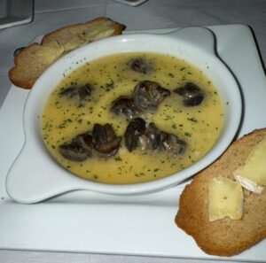 Burgundy snails in garlic herb wine butter, served with rye brie crostini—rich, aromatic, and perfectly balanced. - Crisped Pork Belly