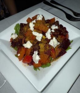 Roasted beets with goat cheese, toasted pistachios, arugula, and citrus reduction—bright, fresh, and well balanced. - Pistachio-Crusted Tilefish