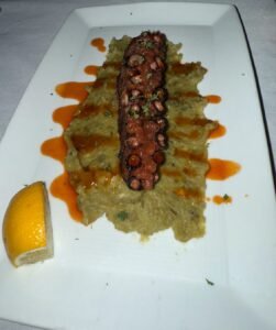 Slow-braised pork belly with compressed watermelon, feta crumble, and a garlic chipotle honey glaze—sweet, savory, and beautifully textured. - Charred Spanish Octopus