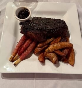 Accompanied by lobster bisque reduction, potato gratin, and charred jumbo asparagus—elegant and deeply flavorful. - Bison Rib Eye